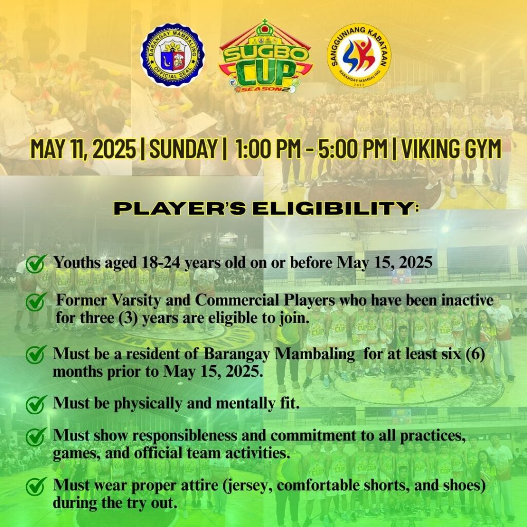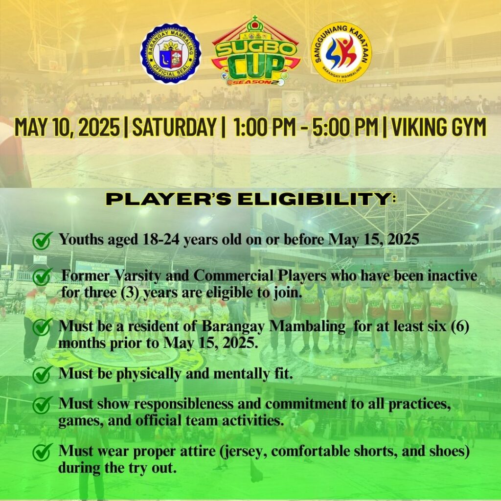 The Sangguniang Kabataan of Barangay Mambaling invites all eligible youth to showcase their talent and represent our barangay in this yearβs SUGBO CUP 2025 for Basketball and Womenβs Volleyball.