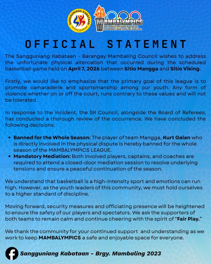The Sangguniang Kabataan of Barangay Mambaling would like to address an incident that occurred during the Mambalympics Season 2 game […]
